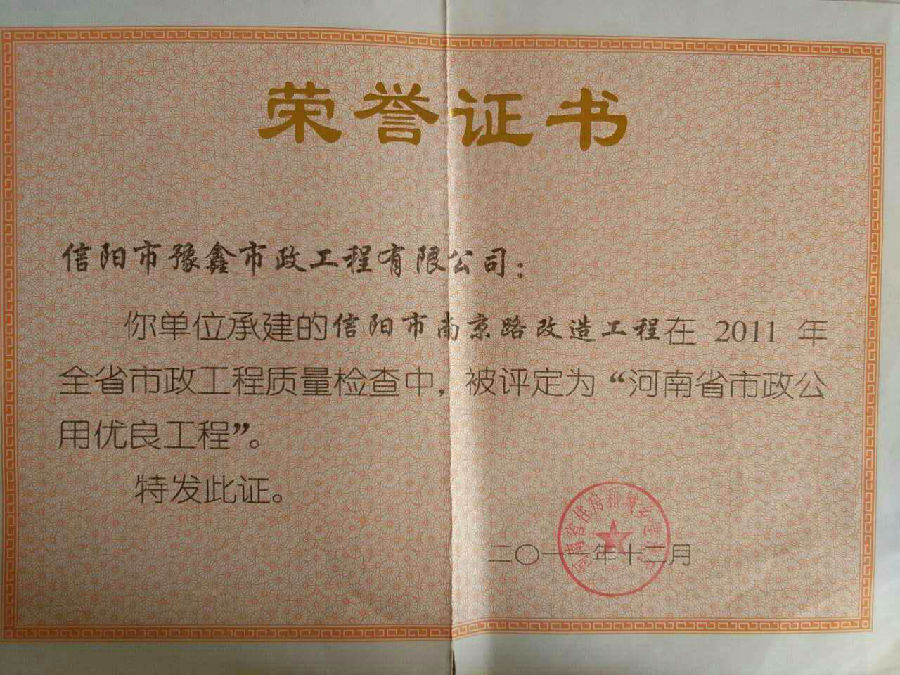 好風(fēng)憑借力,送我上青云。近年來,公司積極參與城市市政基礎(chǔ)設(shè)施建設(shè)施工,積極參與市場競爭,先后承擔(dān)施工了市政府重點(diǎn)工程南京路道路改造工程、春曉路道路改造工程,東方紅大道道路改造工程、龍江東路新建工程等重點(diǎn)民生工程,其中南京路道路改造工程被省建設(shè)廳評為“中州杯”, 春曉路和東方紅大道道路改造工程被省建設(shè)廳評為“省優(yōu)工程”,成為城區(qū)一道道亮麗的風(fēng)景線。參與施工了市典范小區(qū)“臺北城上城”、“恒大名都”以及師范學(xué)院、職業(yè)技術(shù)學(xué)院、交警支隊(duì)和軍區(qū)道路工程,參與施工了雞公山管理區(qū)、南灣管理區(qū)、明港鎮(zhèn)和羅山縣等部分道路小區(qū)工程施工,累計(jì)大小各類施工工程三百余項(xiàng),企業(yè)影響力不斷擴(kuò)大、輻射力不斷增強(qiáng),市場份額不斷提高,企業(yè)信譽(yù)不斷彰顯,為信陽城市建設(shè)做出了積極貢獻(xiàn),為企業(yè)的可持續(xù)發(fā)展插上了騰飛的翅膀。
